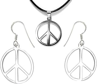 3 Stück Peace Zeichen Silber aus Metall mit Stoffband Kette zum umhängen als Halskette und Peace Zeichen Ohrring Schmuckset mit einer Box