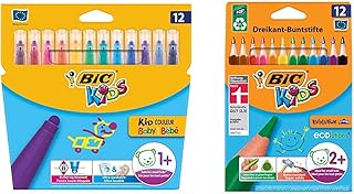 BIC Kids Fasermaler Kid Couleur Baby Stifte – 1 x 12 Babystifte in bunten Farben & ECOlutions Evolution Buntstifte – Bruchsichere Mine – Ohne Holz – Buntstifte Set mit 12 Buntstiften