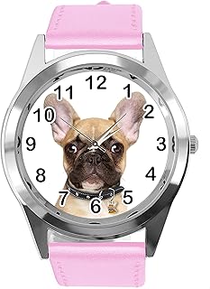 Armbanduhr Analog Quarz mit Echtlederband Pink Rund für Französische Bulldogge Fans