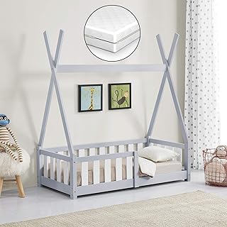 [en.casa] Kinderbett mit Matratze 70x140cm Hellgrau mit Rausfallschutz im Tipi Design aus Kiefernholz Jugendbett Bett Holzbett Hausbett